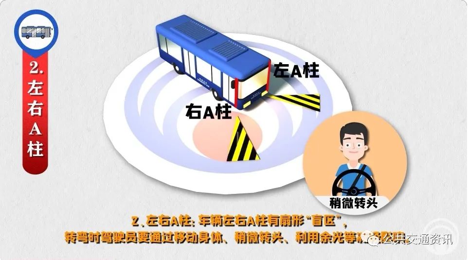 2、左右A柱:車輛左右A柱有扇形“盲區(qū)”,轉(zhuǎn)彎時(shí)駕駛員要通過移動(dòng)身體、稍微轉(zhuǎn)頭、利用余光等減輕影響。