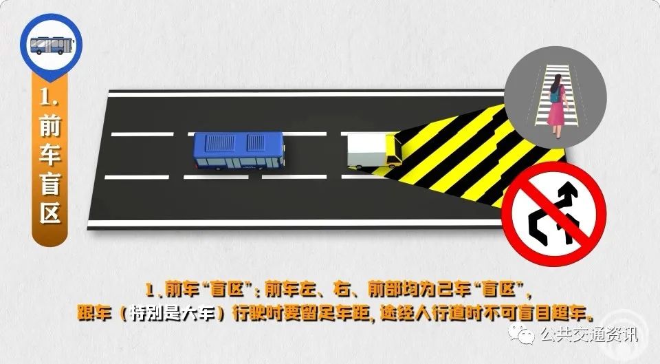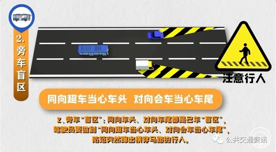2、旁車“盲區(qū)”:同向車頭、對向車尾都是己車“盲區(qū)”,駕駛員要做到“同向超車當(dāng)心車頭、對向會(huì)車當(dāng)心車尾”,防范突然躥出橫穿馬路的行人。