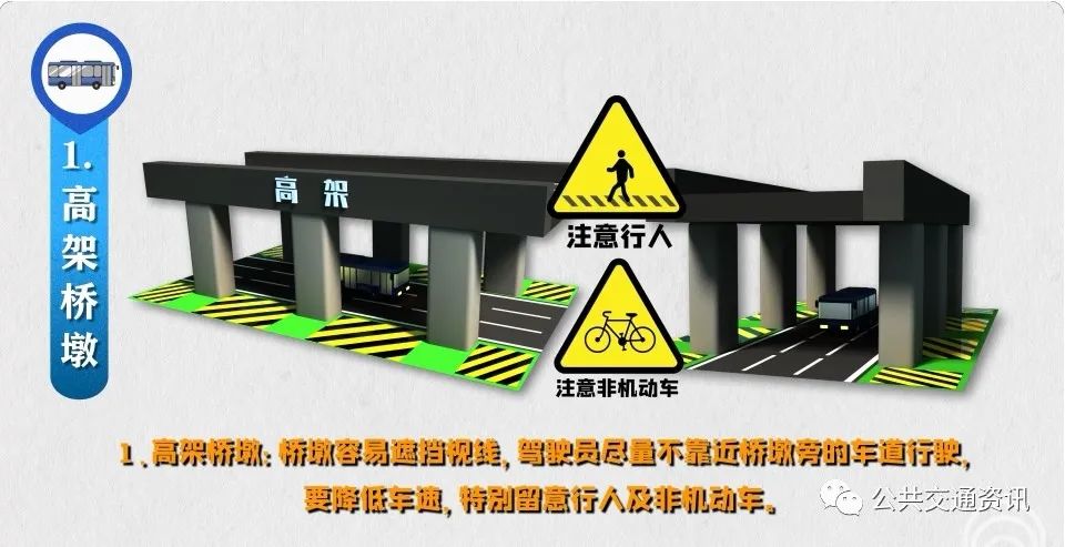 1、高架橋墩:橋墩容易遮擋視線,駕駛員盡量不靠近橋墩旁的車道行駛,要降低車速,特別留意行人及非機(jī)動(dòng)車。