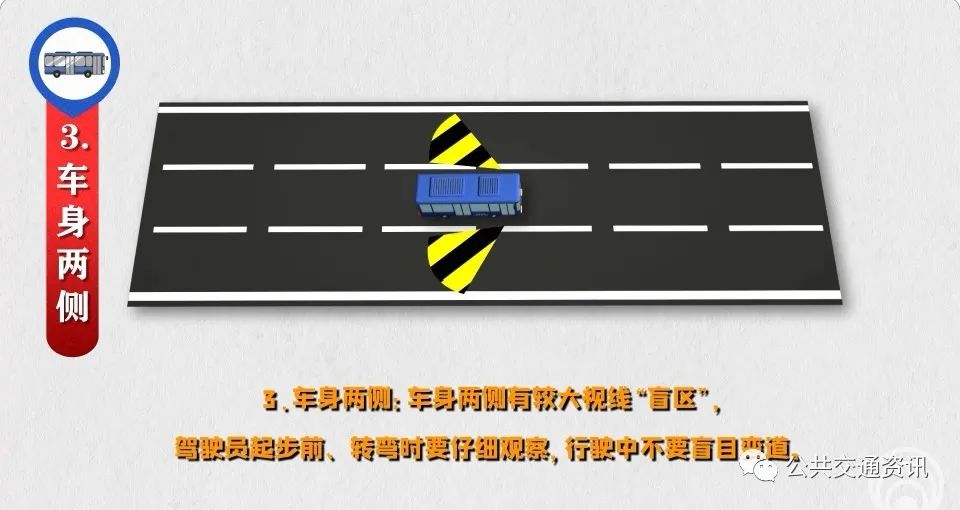 3、車身兩側(cè):車身兩側(cè)有較大視線“盲區(qū)”,駕駛員起步前、轉(zhuǎn)彎時(shí)要仔細(xì)觀察,行駛中不要盲目變道。