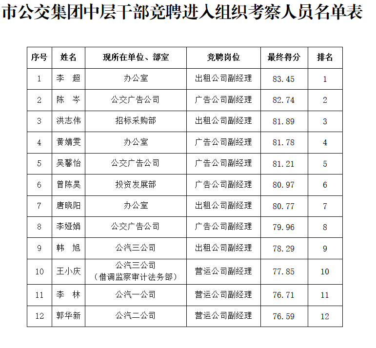 根據市公交集團中層干部競聘工作要求,共有12名競聘者(最終得分前12名)進入組織考察環(huán)節(jié),現將人員名單公示如下(見附件)。