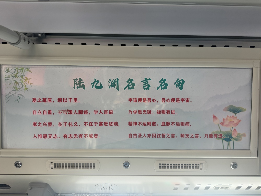 “陸九淵號”不僅僅是一條公交線路,更是一個移動文化陣地。當(dāng)你踏上這趟公交車,你會被駕駛員的熱情服務(wù)所感染,他們微笑著迎接每一位乘客,以優(yōu)質(zhì)的服務(wù)彰顯著荊門的文化精神和城市溫度。車輛全部采用新能源公交車,不僅環(huán)保節(jié)能,行駛起來也更為平穩(wěn),同時,在車輛內(nèi)外裝飾以及“進(jìn)站、出站、溫馨提示”等場景語音播報融入陸九淵相關(guān)元素,讓乘客潛移默化的加深對荊門文化的認(rèn)識和理解。